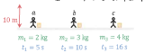 7. يبين الشكل ثلاثة عمال يريد كل منهم رفع صندوق إلى ارتفاع $10 \text{ m}$. فإذا كان المكتوب تحت كل صندوق كتلته والزمن الذي يستغرقه كل منهم، فأيهم أكبر قدرة؟ ($g = 10 \text{ m/s}^2$).
